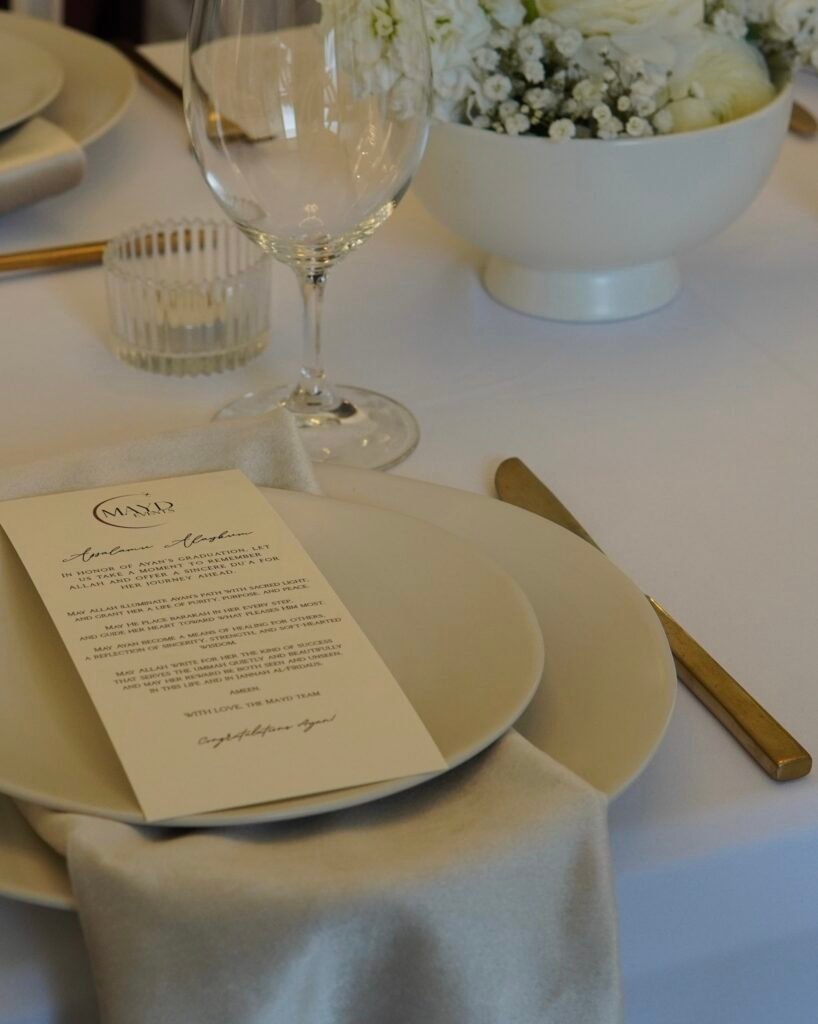- Carefully crafted du’a cards placed at each guest setting, featuring meaningful Islamic supplications